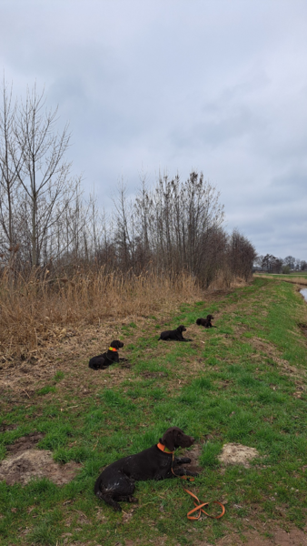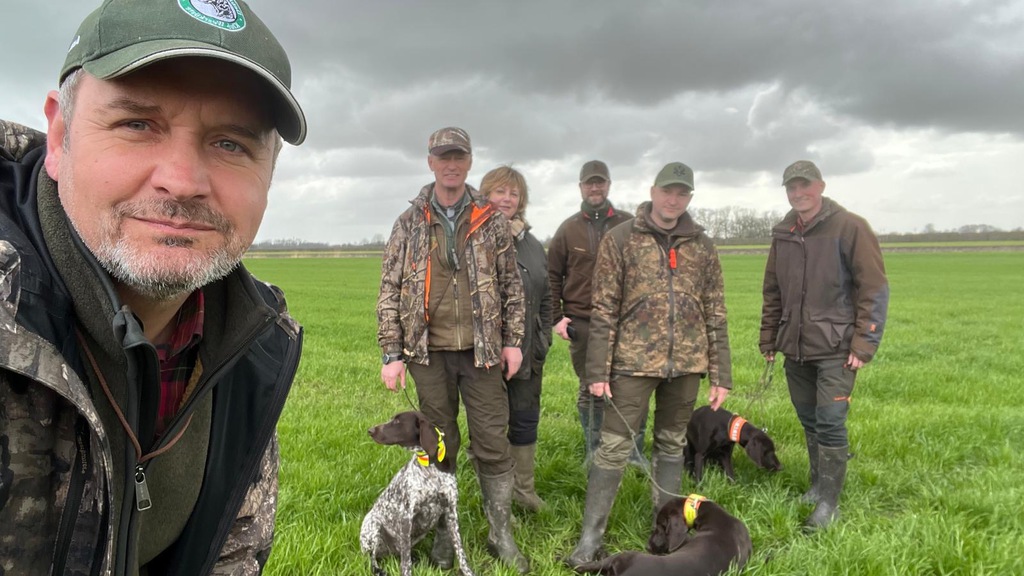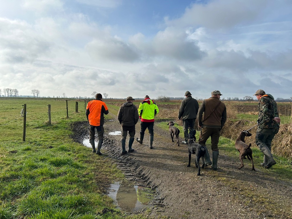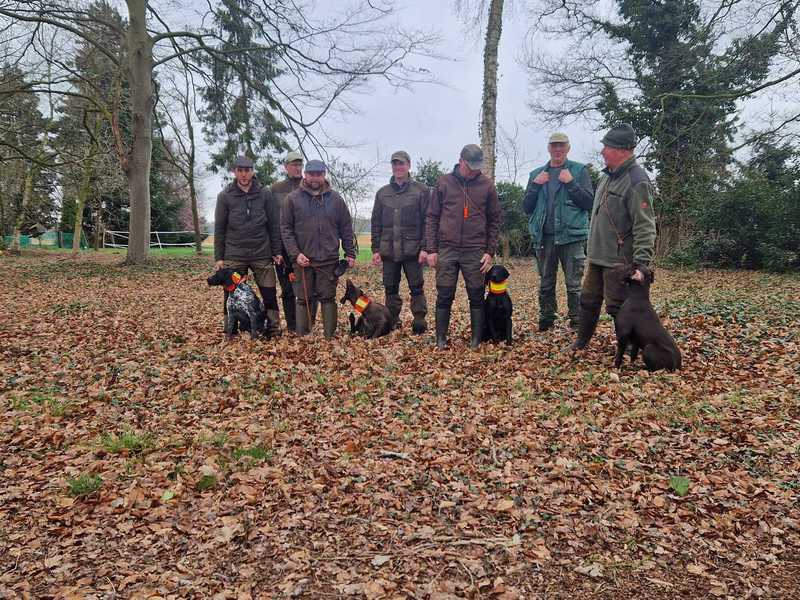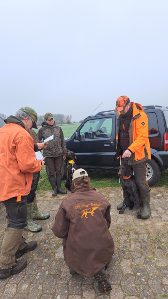 Am 23.03.2024 fand im Revier Wulfhoop bei Stuhr unser erstes Derby statt. Gemeldet waren 5 Hunde. Angetreten 5 Hunde, die alle einen ersten Preis mit nach Hause nehmen konnten! Herzlichen Glückwunsch und Waidmannsheil!! Der Wettergott meinte es gut mit uns: bei böigem Westwind und 8-11 oC wurden wir nur durch einen kurzen Schauer ausgebremst. Ansonst war es deutlich angenehmer als vom Wetterbericht vorhergesagt. Trotz des extrem nassen Winters fanden wir, wie schon im letzten Jahr, einen sehr guten Besatz an Hasen undf Fasanen vor. Schon gegen 12:00h hatten sich die Richter ein Bild von allen Hunden in allen DERBY Prüfungsfächern gemacht. Bei 2 Hunden war eine Bewertung der Leistung auf der Hasenspur gewünscht, die auch für beide Hunde möglich war. Eine Hündin, Falka vom Isenseeer Kajedeich, fiel durch ihre wiederholt gezeigte, hervorragende Vorstehleistung (4h) auf.