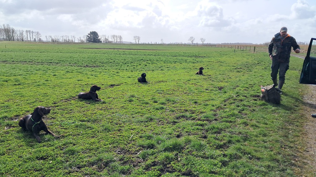 Das ist nun das Ergebnis von 3,5 Jahren Zusammenarbeit mit einem tollen Rüden. Eigentlich wollte ich nur eine Hasenspur führen und war deshalb auf der Suche nach einem Hund zum Ausbilden. Schon bei der Geburt des C-Wurfes vom Isenseer Kajedeich fiel mir klein Carlos ins Auge. Der Zufall ergab, dass Thomas sich ausgerechnet diesen Welpen aussuchte und ich ihn ausbilden durfte. Derby in Osten und VJP beim JGV Stade liefen wie geschnitten Brot, bei der Solms bekamen wir einen Kleinen Dämpfer. Bei der VGP des DK-Klubs Weser Bremen war Carlos dann wieder der Alte. Mit diesem tollen Ergebnis wagten wir uns erneut an eine Solms, bevor Carlos den Herbst bei seinen Besitzern verbrachte. Im Jahr 2023 bescherte mir Carlos einen SCHWEIßtreibenden Sommer, den wir im September jedoch mit einer bestandenen Verbandsfährtenschuhprüfung abschließen konnten, nachdem wir im Juni auf der Schweißfährte zunächst versagt hatten. Auch wenn unsere Prüfungslaufbahn keine reine Glanzleistung war, hat Carlos mir gezeigt, dass es sich lohnt, nicht aufzugeben. Und dass ein zweiter Versuch keine Schande ist. Am vergangenen Wochenende haben Carlos (Carl-Otto) und ich an der Dr. Kleemann-Zuchtauslese-Prüfung teilgenommen. In Mittelsten-Thüle angekommen habe ich einen gemütlichen Schattenparkplatz unter großen Eichen ausgesucht – die Sonne schien, Carlos sollte noch kurz im Auto bleiben, bis ich die Papiere abgegeben habe. Auf dem Weg zum Suchenlokal habe ich schon Heinz-Georg und Elisabeth getroffen und die tolle Vereinskleidung überreicht bekommen. Bis zur Anmeldung dachte ich eigentlich noch, ich gehe ganz entspannt an die Sache ran. Pustekuchen. Schon mein Zettelchaos hat mich das erste mal ins Schwitzen gebracht. Nachmittags bei strahlendem Sonnenschein die Zuchtschau. SG. (Naja, Form jagt ja nicht. Entscheidend ist, was morgen passiert). Abends haben wir ein Schnitzel Försterin beim Frischehof Döpke gegessen und dabei die Truppe von DK Westküste kennengelernt. Danach ging es früh zu Bett, um ausgeruht in die Feld- und Wasserarbeit zu starten. Am Freitagmorgen galt es, zeitig aufzustehen: Treffen am Sammelpunkt in Ihlow war für 7:30 Uhr angesetzt. Beim Packen des Autos ein Schreck: der Erpel war in seiner Umhüllung aus Zeitungspapier nicht aufgetaut. Dieser musste dann zunächst in den gut geheizten Fußraum vom Golf umziehen. In Ihlow angekommen begrüßte uns Revierführer Robert und wir konnten in einem großartig mit Fasanen und Hasen besetzten Revier 4 Suchengänge zeigen (Am Schilfgraben auf gepflügtem Acker, in einer Baumschulplantage, auf Getreidestoppel (Paarsuche) und in einer Grünbrache). Vor lauter Hasen wusste man kaum, wo man sicher zutreten konnte. Aber das beste war, dass von jedem Ort in diesem Revier Windmühlen zu eräugen waren, sodass ich mir stets sicher sein konnte, woher der Wind weht.